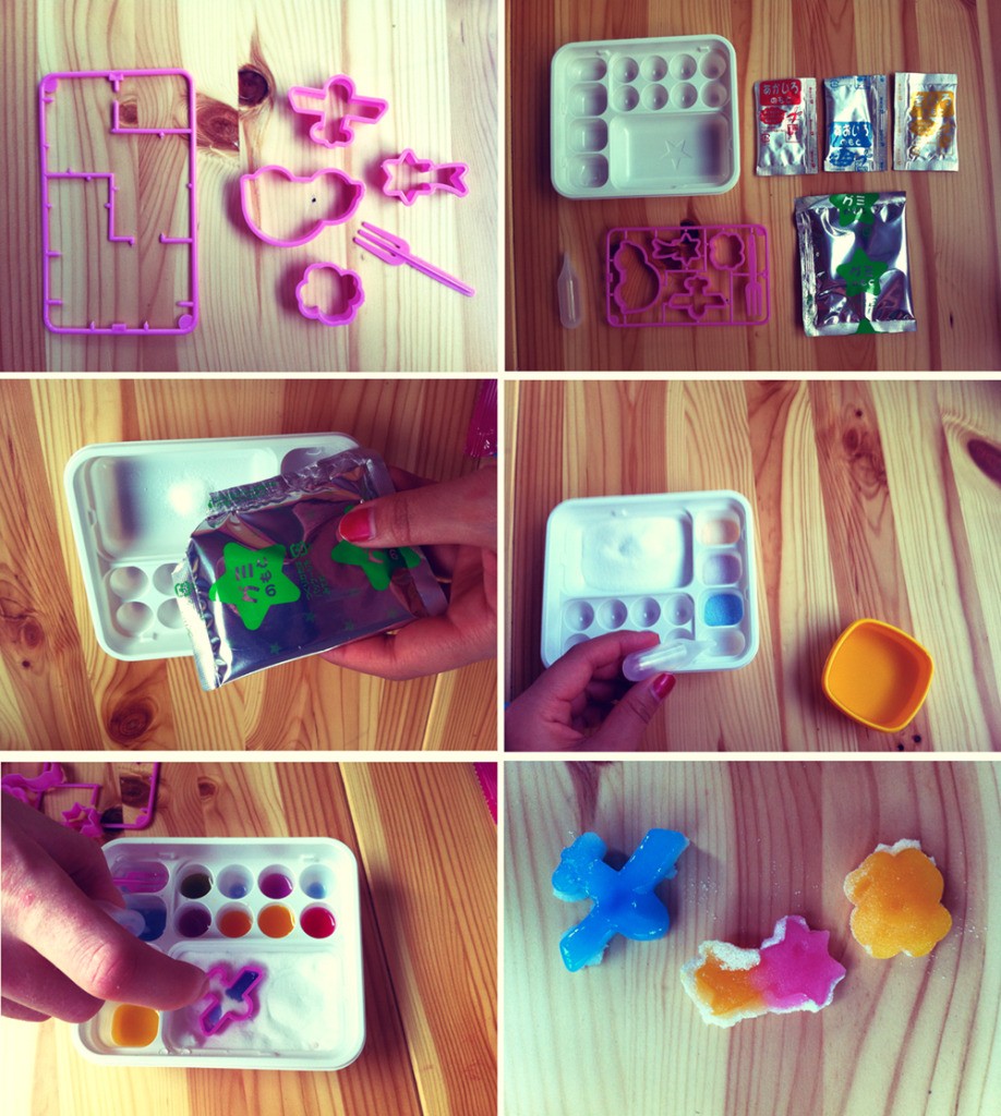 Mainan ini dilengkapi dengan bentuk kue-cutter kartun, paket permen bubuk berwarna-warni, dan sebuah nampan kecil untuk membuat permen itu terlihat asli. itu super mudah digunakan, dan hanya membutuhkan satu menit untuk membuat permen asli yummy. Setiap anak kecil di Jepang suka membuat permen seperti ini untuk mengerjai temannya. Dan aku harus mengakui, itu hanya sebagian kesenangan saya saat masih SD.jadi cobalah !!!